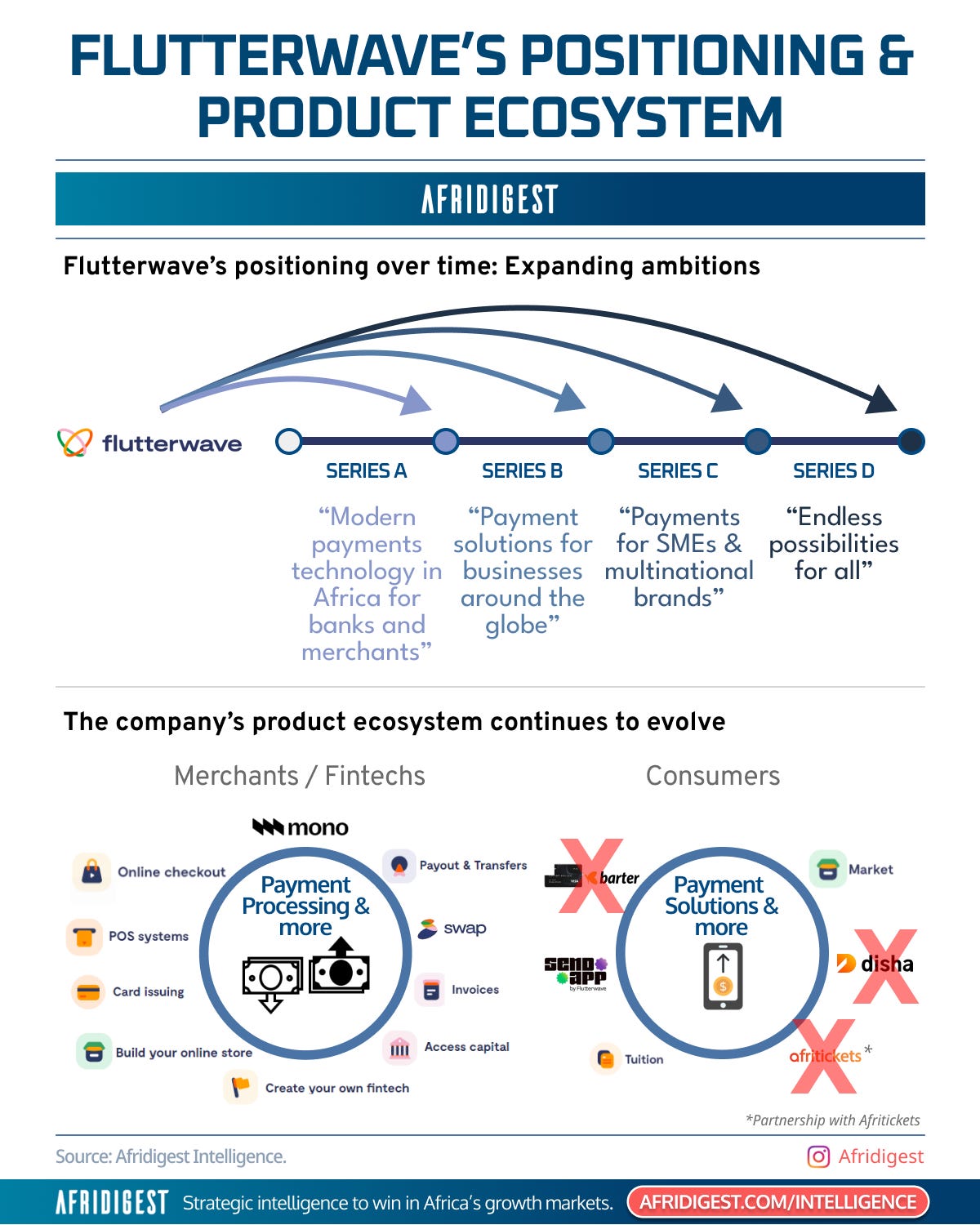 On the merchant and fintech side, Flutterwave’s product stack is coherent and cumulative: online checkout, POS systems, card issuing, payouts, invoicing, ‘build your own fintech.’