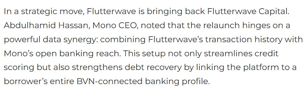 Lending & business banking unlocked. Flutterwave can now underwrite and issue loans to businesses directly. It’ll leverage not only a decade of transaction data but credit scoring and debt recovery capabilities it gained with the acquisition of open banking platform Mono.